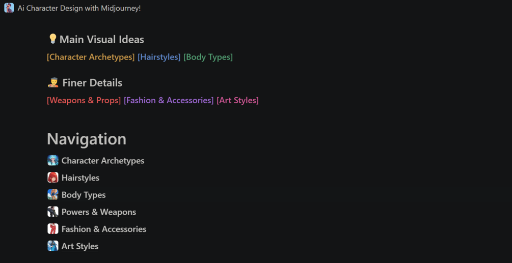 In this ebook tutorial, I cover Ai Character Design using Midjourney. We'll walkthrough fundamental elements of Ai Character Design such as character archetypes, hairstyles, and body types. In addition, we'll look at the finer details of character powers & weapons, fashion & accessories, and art styles for prompting. This Notion ebook guide is great for beginners or advanced users who want a refresher.